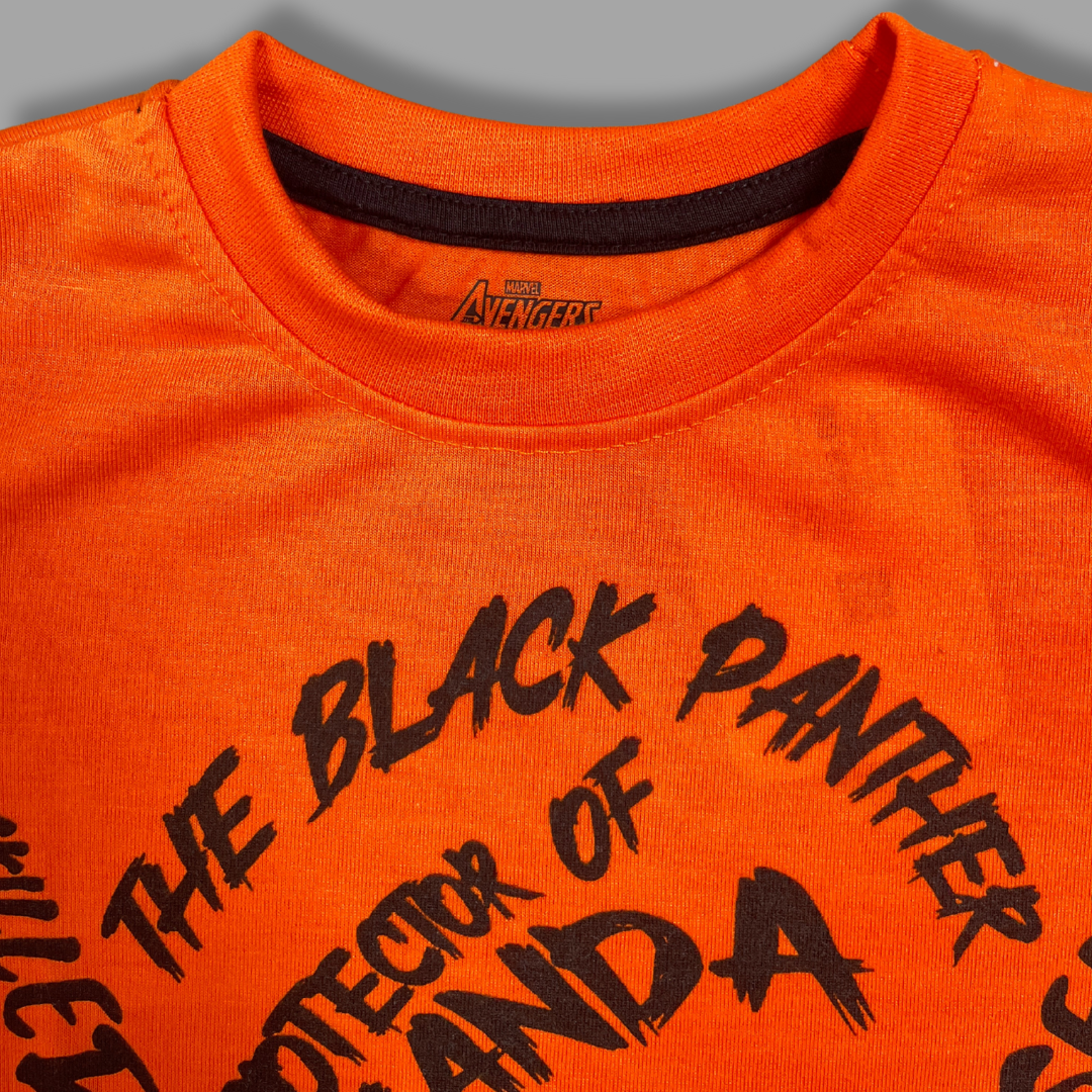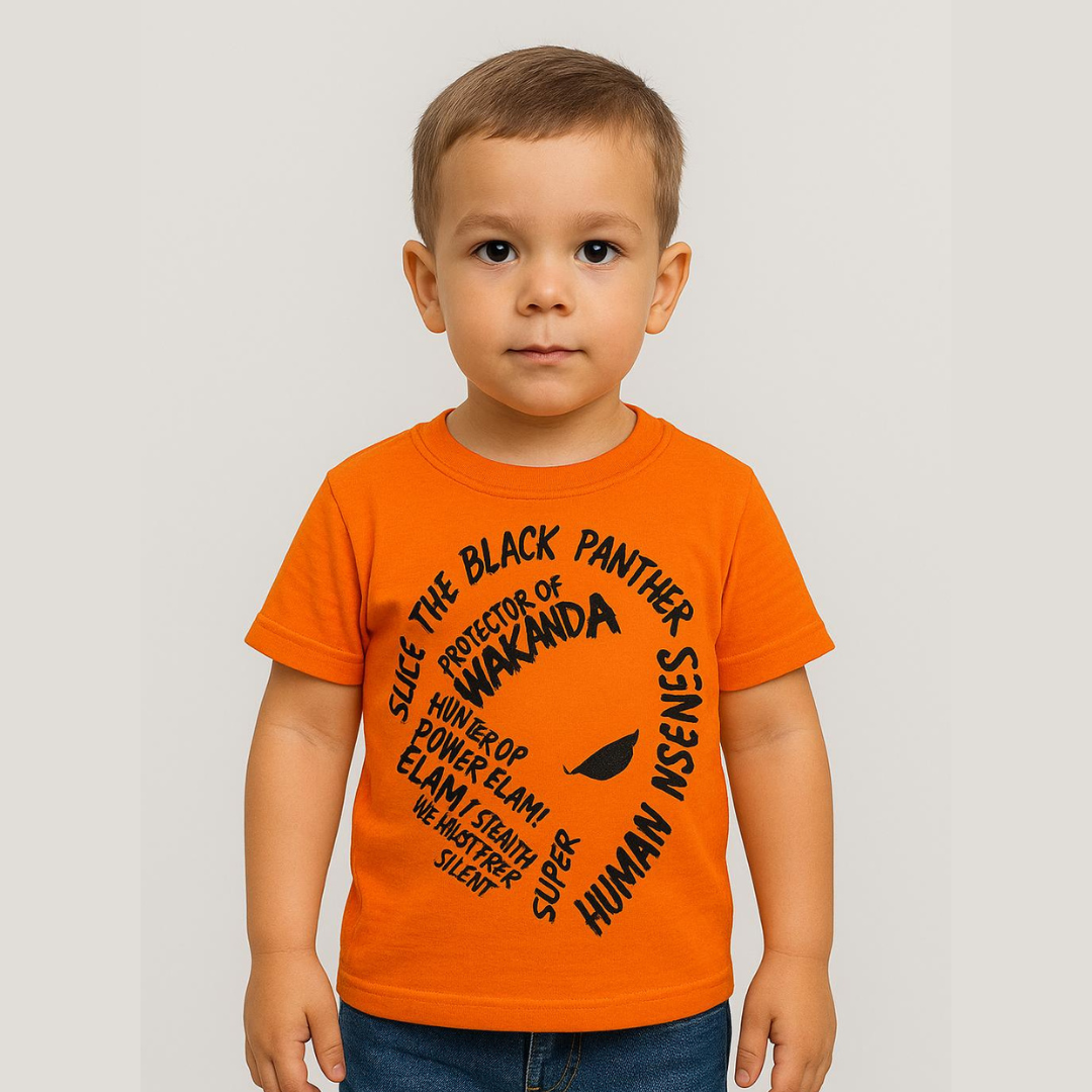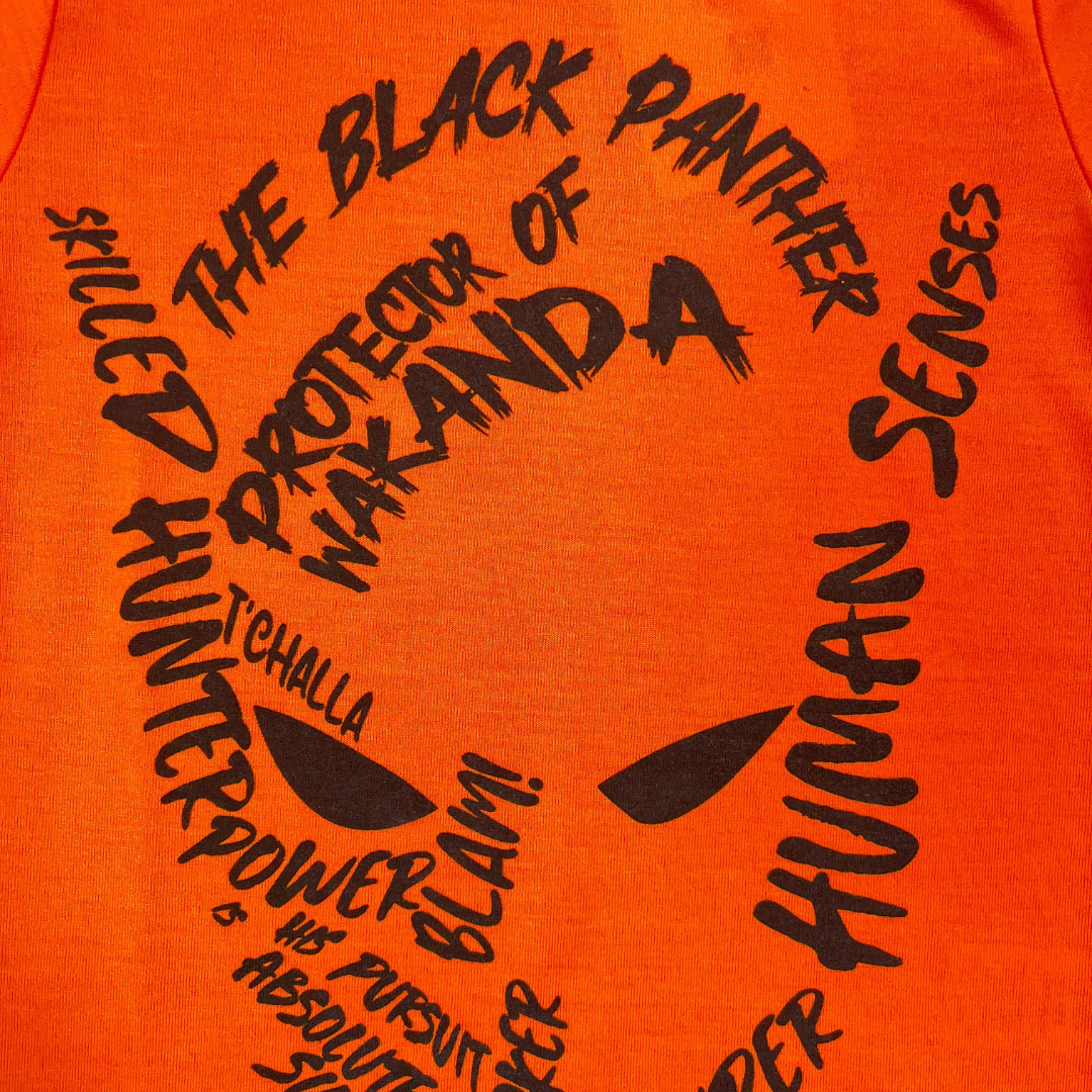 Unleash the power of Wakanda with this bold and vibrant Black Panther T-shirt for kids! Featuring an eye-catching design made up of empowering words and phrases that form the shape of Black Panther's mask, this bright orange tee is perfect for young Marvel fans. Made from soft, breathable fabric, it's great for everyday wear, playtime, or superhero adventures.